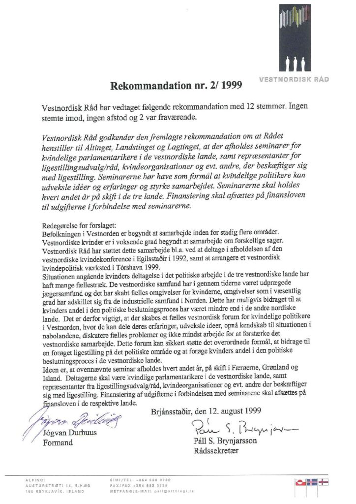 Året 1999 stod i kvindernes tegn i Vestnordisk Råd. Af otte rekommandationer, som blev udarbejdet og vedtaget dette år, handlede de syv om at forbedre kvinders ligestilling og rettigheder. Baggrunden for disse mange ligestillingsrekommandationer var, at der i juni samme år havde været arrangeret et kvindepolitisk værksted i Tórshavn. Værkstedet var arrangeret af Vestnordisk Råd sammen med den færøske Kvindeforeningssammenslutning, Kvindesagsforeningen i Island og det grønlandske Ligestillingsråd. Konklusionerne fra værkstedet blev transformeret til rekommandationer fra Vestnordisk Råd til vores respektive regeringer.
