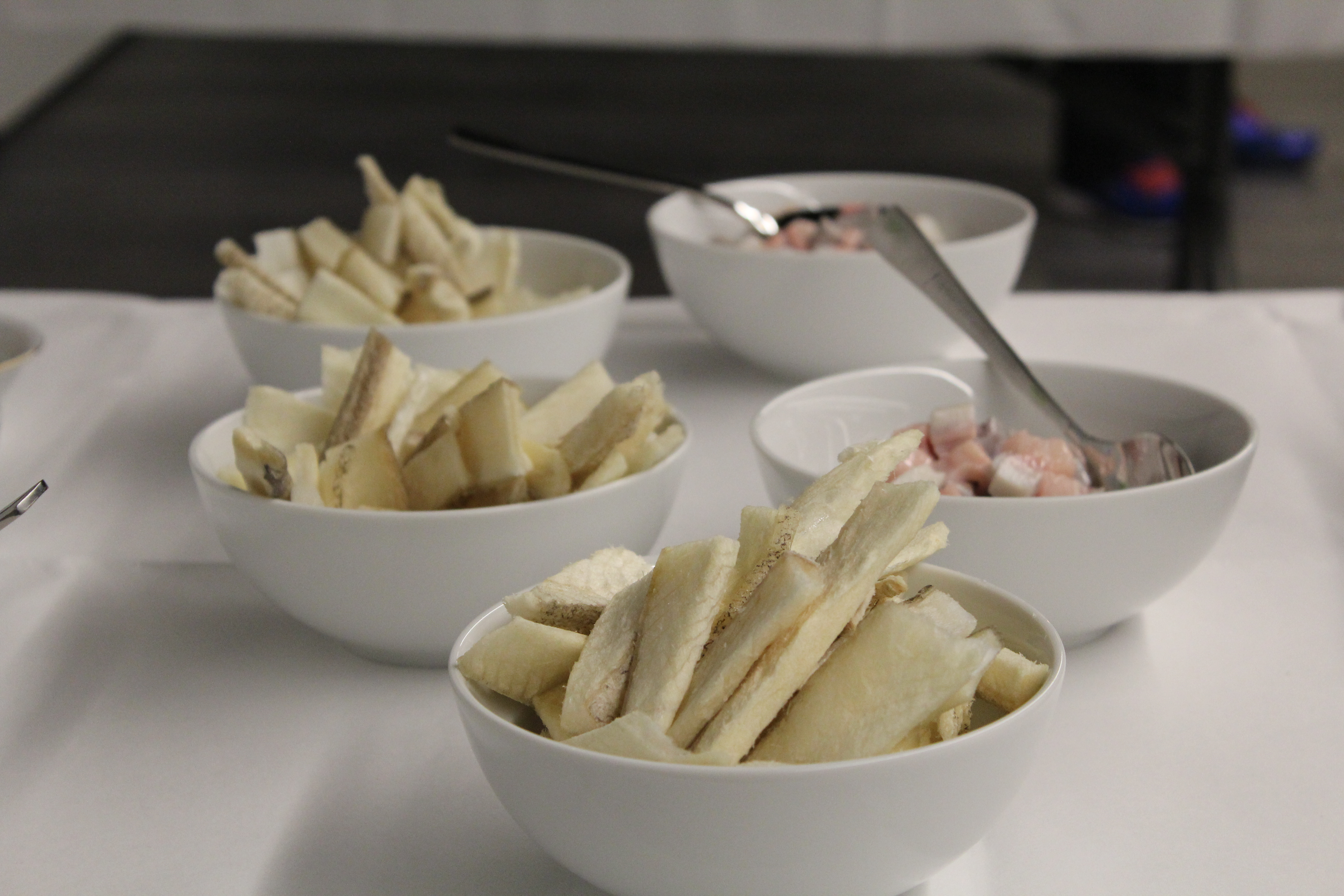 Efter præsentationer og første sangindslag bød Royal Greenland på grønlandsk proviant. Her frysetørret hellefisk, mattak (hvalhud) og frossen hellefisk serveret med soyasauce
