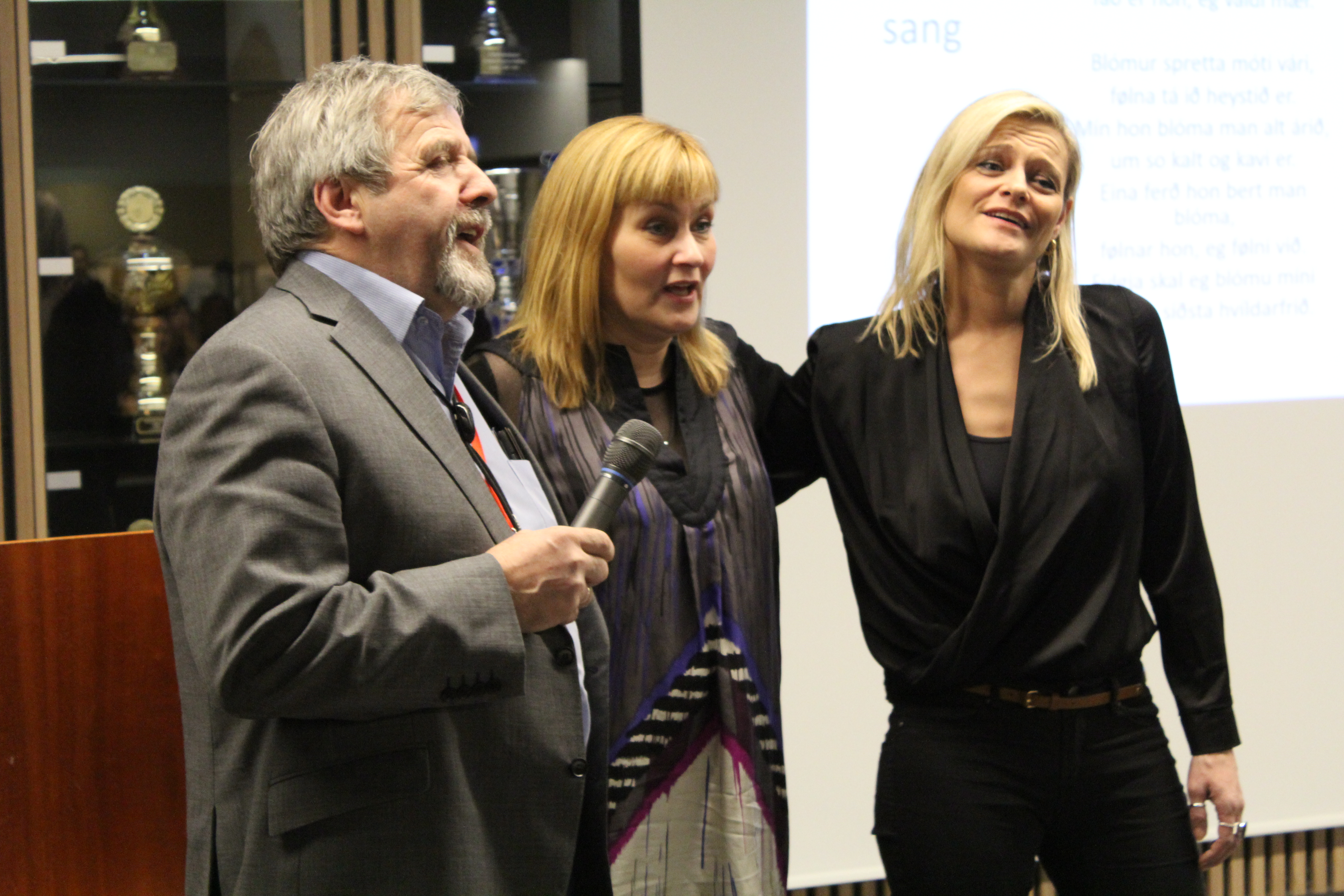 IMG_9020 hvor Kári Páll Højgaard, delegationsformand synger sammen med Bjørt Samuelsen og Annika Olsen