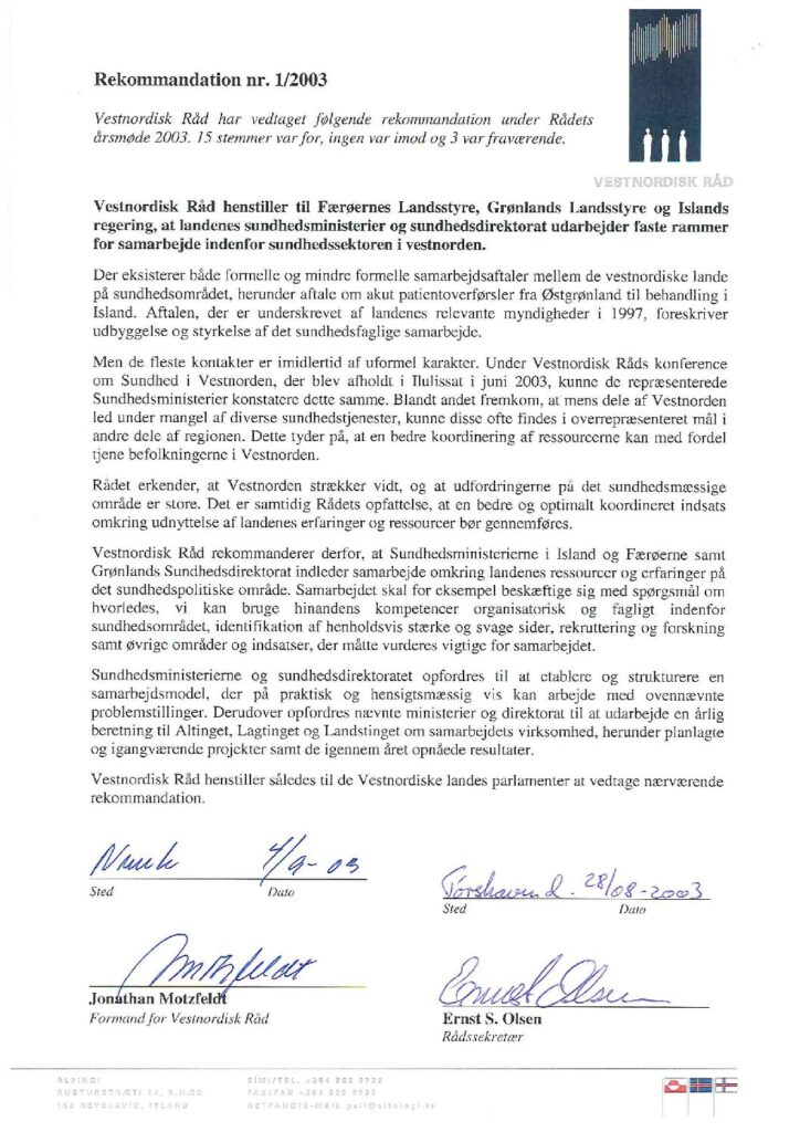 Der bør ikke herske nogen tvivl om, at samarbejdet i vestnordisk råd har været af uvurderlig værdi for de tre nordiske lande, også indenfor sundhedsområdet. Ligeledes at fremtidens udfordringer og muligheder indenfor sundhedsområdet kræver et fortsat tæt samarbejde mellem landene, for at kunne lykkes optimalt. De udfordringer og geopolitiske ændringer, som i dag med hast breder sig gennem verden, bør få vores tre lande, omend små hvad angår folketal, at løsrive os fra historiske hindringer for optimalt at kunne betjene ikke blot vores egne, men også nabolandenes befolkninger, på det så vigtige område som sundhed og velstand er.