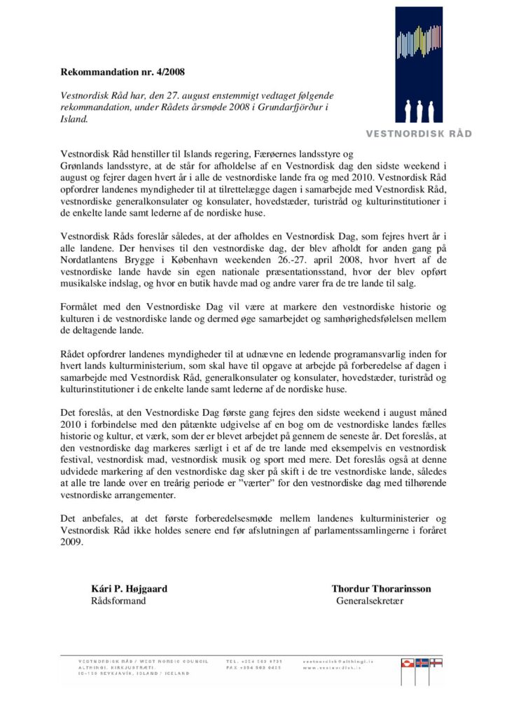 Det forslag, som enstemmigt blev vedtaget og er mest iøjnefaldende og levende som en årlig begivenhed, er den fælles Vestnordiske dag.