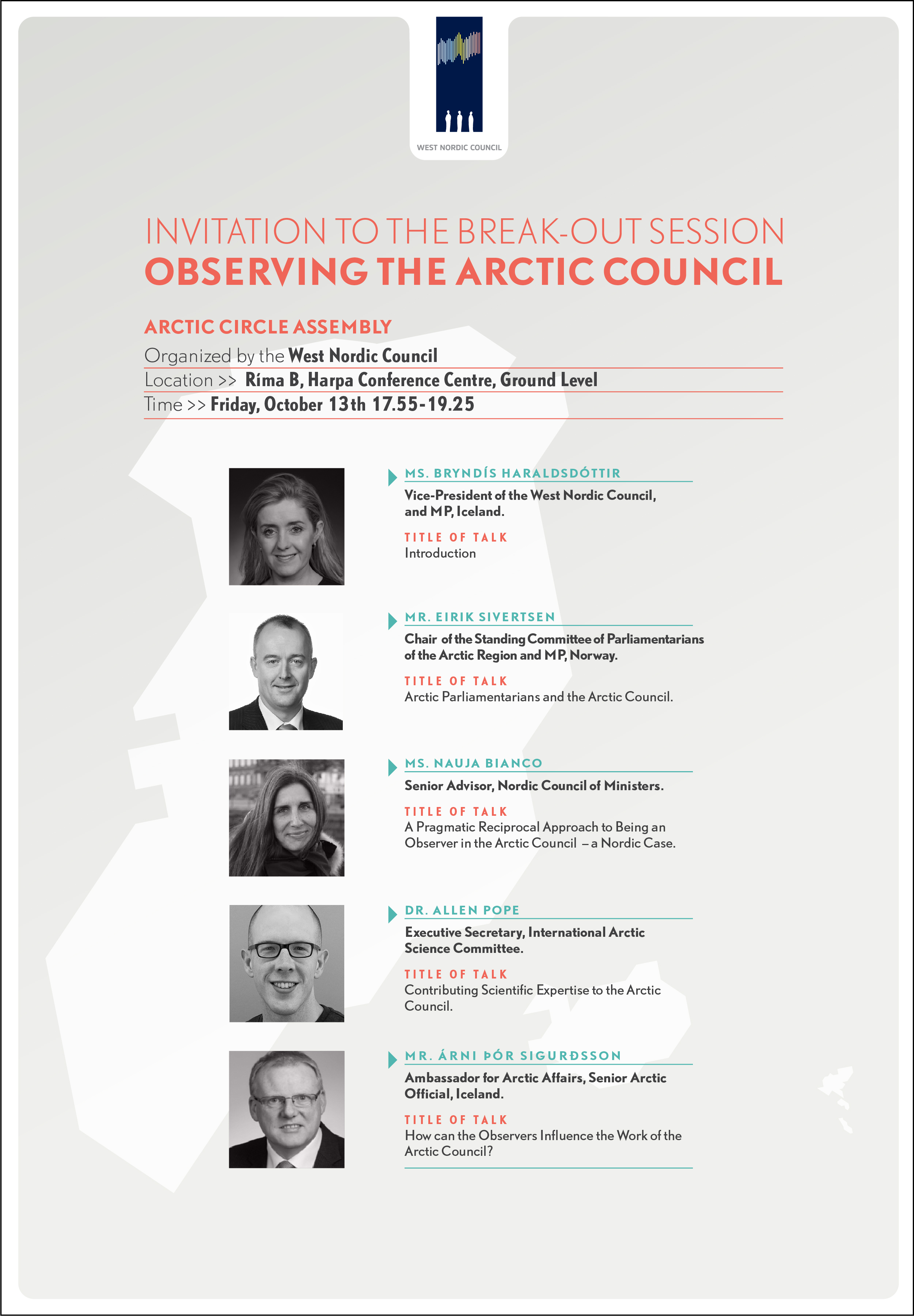 Vestnordisk Råd afholdt en break-out-session på Arctic Circle Assembly konferencen i Reykjavik den 13. oktober. Sessionen fokuserede på den rolle observatører spiller indenfor Arktisk Råd. Vestnordisk Råd blev observatør i Arktisk Råd i maj 2017. Fire forskellige observatører bidrag til mødet: Eirik Sivertsen på vegne af Standing Committee of Parliamentarians of the Arctic Region, Nauja Bianco på vegne af Nordisk Ministerråd, Allen Pope på vegne af International Arctic Sicence Committee, og Bryndís Haraldsdóttir på vegne af Vestnordisk Råd. Desuden afdækkede Islands Arktiske ambassdør i Arktisk Råd, Árni Þór Sigurðsson, hvordan de, der styrer Arktisk Råd, ser på observatørernes rolle og værdien af deres bidrag.