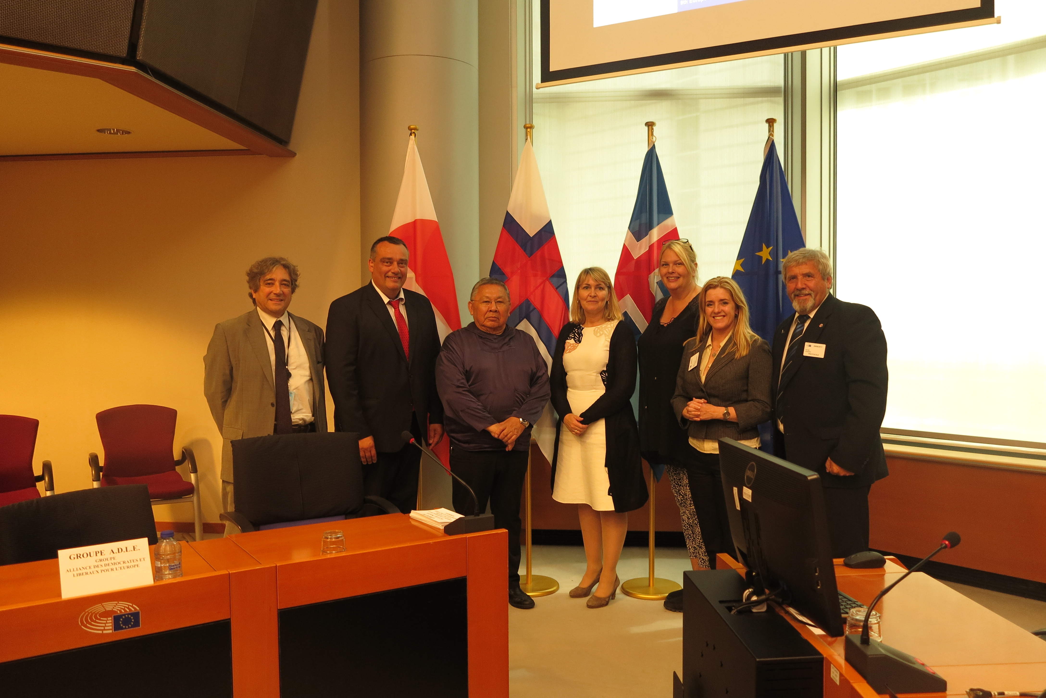 Fra venstre: Ricardo SERRÃO SANTOS, medlem af Europaparlamentet fra Portugal, Jørn Dohrmann, Medlem af Europaparlamentet og formand for DEEA, Lars-Emil Johansen 2.viceformand for Vestnordisk Råd og formand for det grønlandske parlament, Inatsisartut, Christel Schaldemose, Medlem af Europaparlamentet fra Danmark, Anna Hedh, medlem af Europaparlamentet og næstformand for DEEA fra Sverige, Bryndís Haraldsdóttir, formand for Vestnordisk Råd og medlem af Islands parlament, samt Kári Páll Højgaard, 1.viceformand for Vestnordisk Råd og medlem af det færøske parlament. Julie Pitera, medlem af Europaparlamentet fra Polen mangler på billedet.