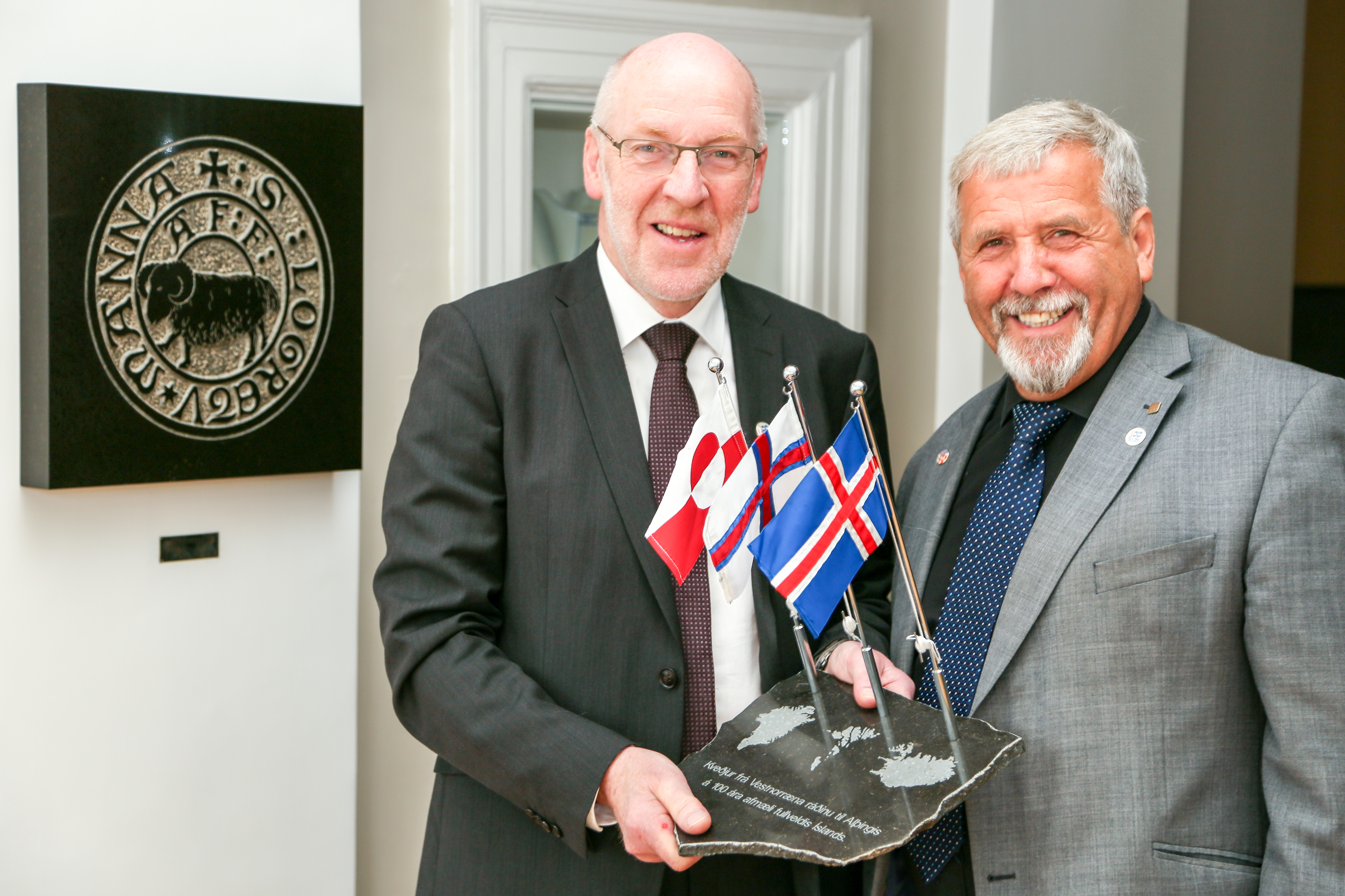 Vestnordisk Råds formand Kári P. Højgaard var inviteret til Altingets 100 års jubilæum for Islands uafhængighed den 18. juli 2018. Vestnordisk Råd fik fremstillet gave til Altinget i anledning af jubilæet. Kári P. Højgaard forærede gaven til Steingrímur J. Sigfússon, Altingets formand. Gaven blev lavet af Føroya Grótvirki, Skopun som ejes af brødrene Tausen.
